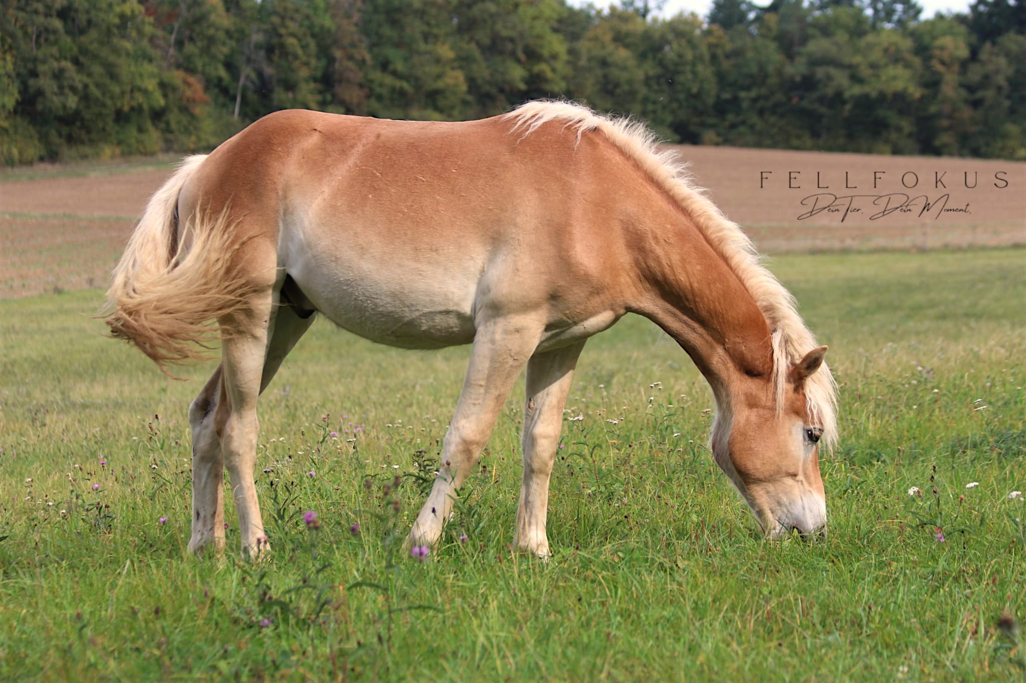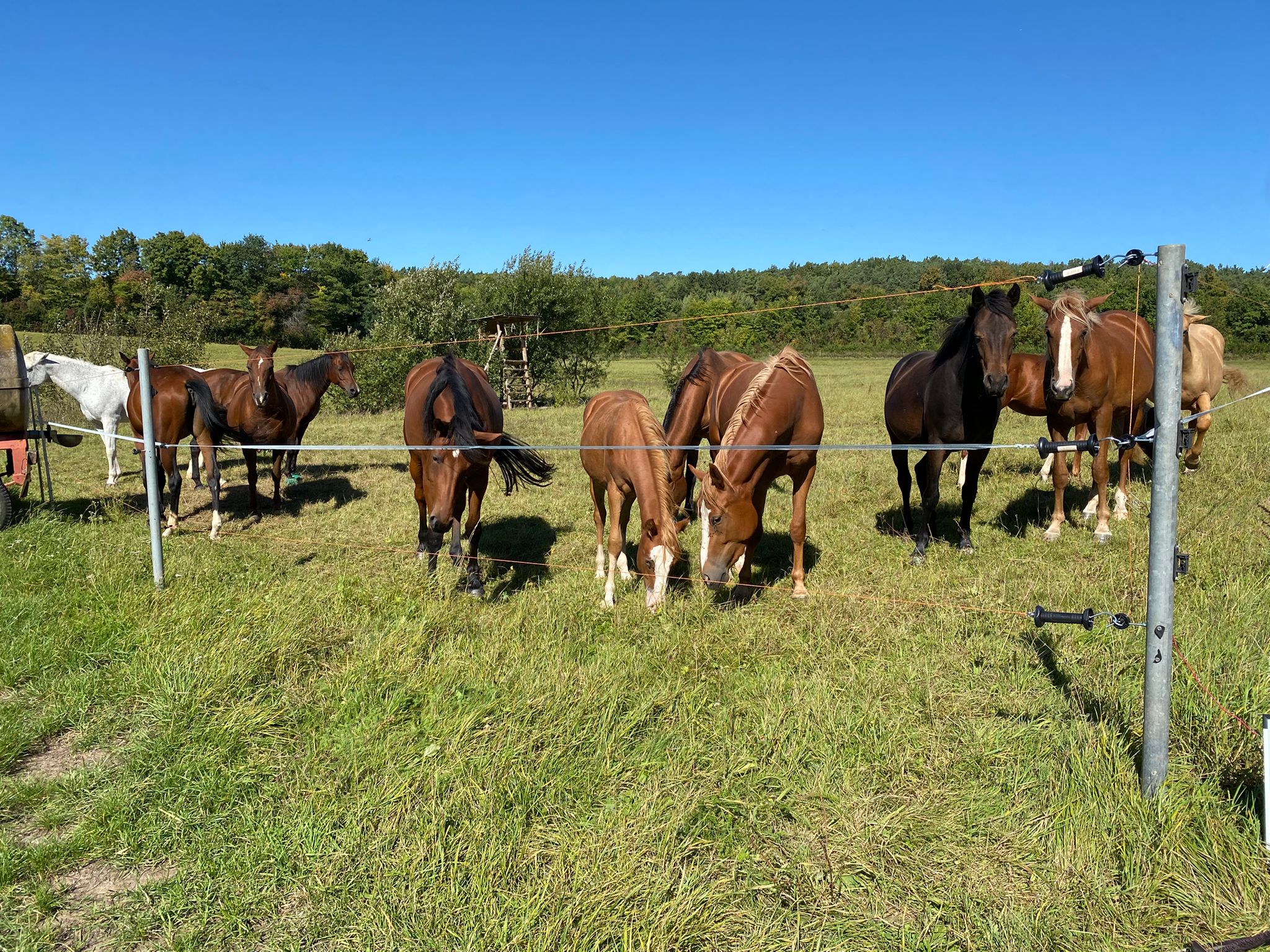 Im Sommer stehen die Pferde 24h auf unseren über 20 ha großen Weiden, auf denen sie sich richtig austoben und spielen können. Zusätzlich erhalten die Pferde Heu aus Raufen, um eine ausreichende Versorgung mit Rohfaser sicher zu stellen. Außerdem stehen sie unter unserer täglichen Kontrolle und werden individuell betreut und versorgt.